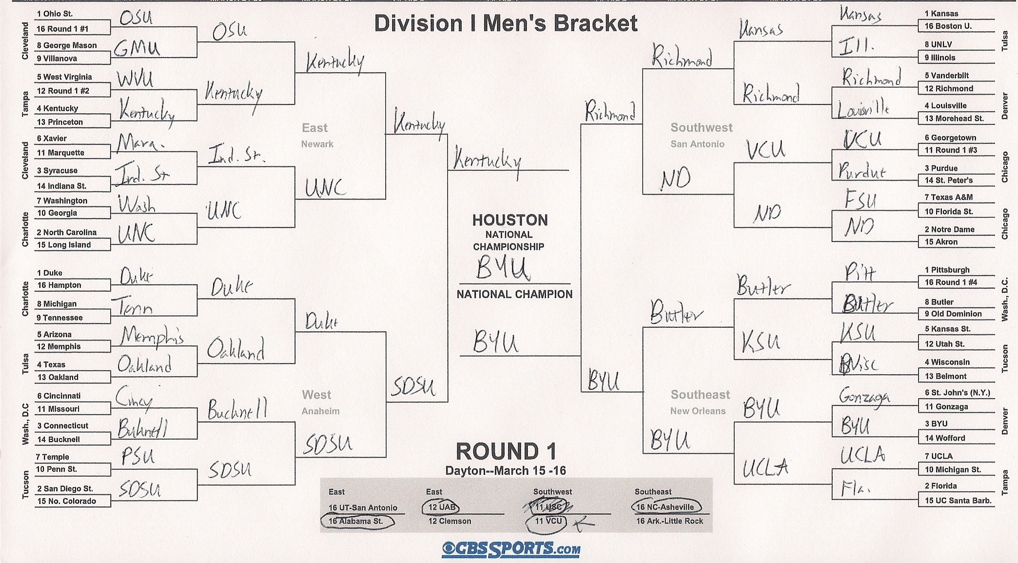 In the meantime, enjoy this look at the NCAA Tournament brackets of a man who follows college basketball only slightly more closely than he follows The Bachelor.