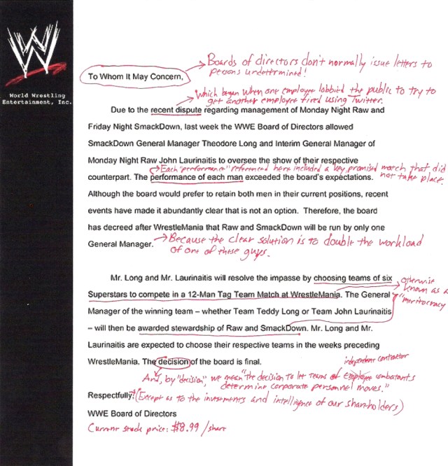 The board issued a statement* this morning that I found to be remarkable in many respects. The document speaks for itself, but I’ve provided some annotations below to add context to the underlying substance. The take-home point is that the manner in which the corporate arm of WWE makes critical personnel decisions is totally foreign to the normal conduct of American industry: