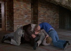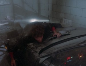 After some “hilarious” banter between KITT and Michael, they drive over to the bar to meet Tanya, per their post-race discussion.  Unfortunately, he discovers that Tanya has sent some low-level goons (the same guys Michael defeated in the race earlier).  Michael informs them that he’s “trained in the martial arts,” and he promptly dispatches them in a scene that’s shot very strangely: We don’t see Michael throw a single punch or kick.  We only see a series of shots of the toughs falling backwards into patrons, through tables, etc.  The goons eventually wind up in a pile outside the bar.