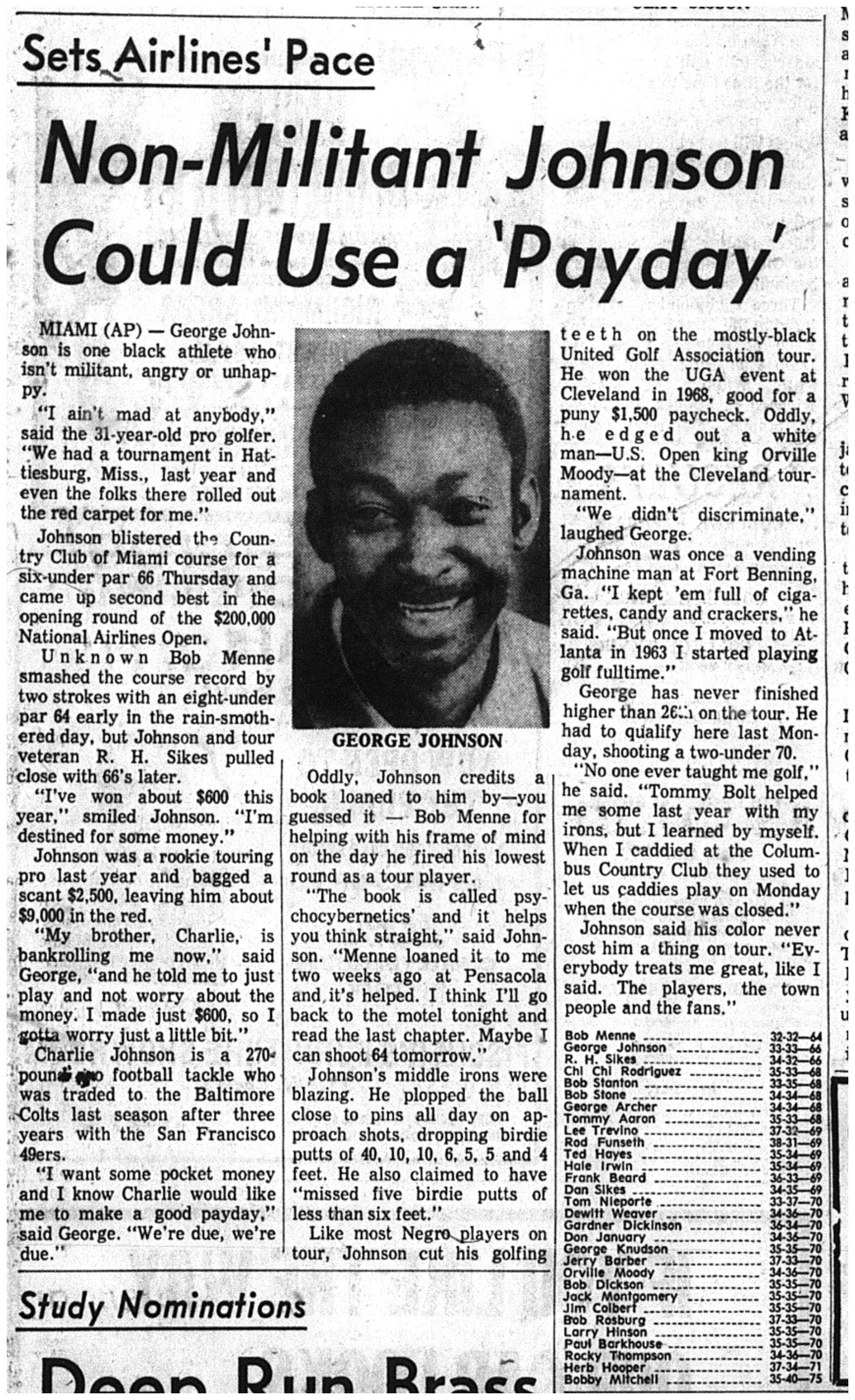 The article goes on to say, “Like most Negro players on tour, Johnson cut his golfing teeth on the mostly-black United Golf Association tour. He won the UGA event at Cleveland in 1968, good for a puny $1,500 paycheck. Oddly, he edged out a white man…at the Cleveland tournament. ‘We didn’t discriminate,’ laughed George.”
