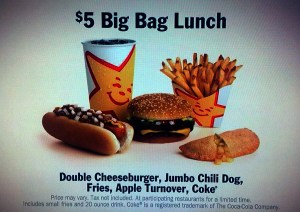 Okay, I’m perhaps a minority in this discussion, but once a month or so I purchase this Big Bag special. It is a great meal for two people. I like the double cheese burger and my wife likes the jumbo chili dog. I usually eat about 3/4s of the burger and she eats about half of the chili dog – between us we eat less than half of the fries. We share a cup of unsweetened iced tea. The fried apple pie gets saved for breakfast or perhaps just eventually gets wasted. At any rate, I dare you to find a better value for 2 to 2 1/2 meals than this. It’s not all about excess, sometimes it’s about value.