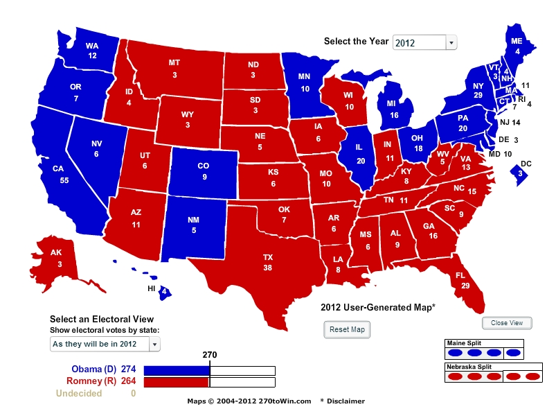 5. Ok, but who wins? My personal opinion is that Silver probably has it close to right, although I’m not sure Obama will get to 315. I thought 300-320 was the appropriate range, until I began playing with the numbers and came up with 274-264. Something in the high 280’s might be more appropriate.