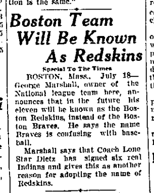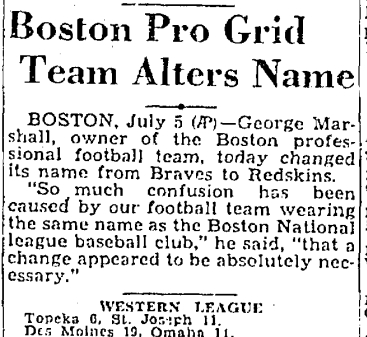 I did find a lot of newspaper accounts of the change, however.  Most of the reports I saw from July 6–8 were short, like the Courant account.  Many had no quotes at all.  For instance, the Lowell (MA) Sun said the following on page 2 of its July 6, 1933 edition: “BOSTON—George Marshall, owner of the Boston professional football team, changes its name from Braves to Redskins.”  That was also an AP report, but that represents the entirety of this particular version.  The UP account of the story was similar, appearing as part of a brief article on NFL expansion.  That piece also had no quotes.