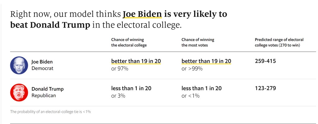 The side-effect of this approach, though, is that I see social-media posts—sometimes consecutively—that present these two competing versions of reality. One side is absolutely convinced that we’ll look back on this election and say, “Oh, of course Biden won. It was all so obvious. Just look at the polls.” The other side points to credible, countervailing indicators (as well as the example of 2016) and says that another Trump victory is just as obvious.