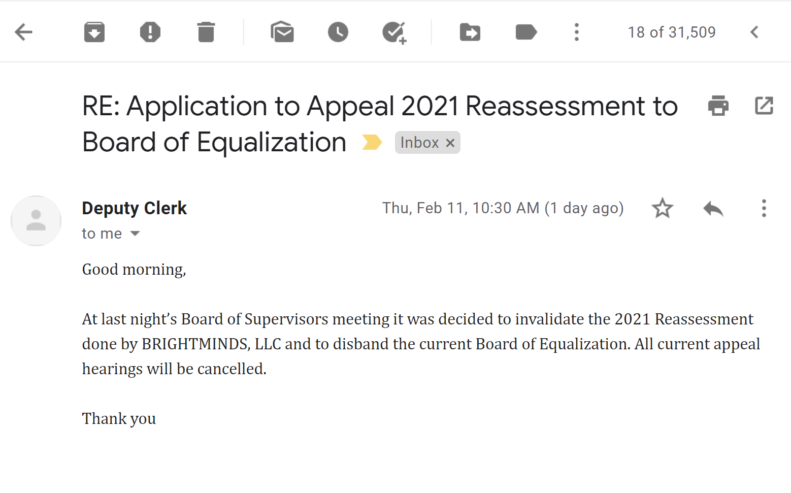 The negative feedback on the process, and on the substance of the appeals themselves, was so overwhelming that King William decided to cut its losses. The county did so by bailing on both the ironically-named consultant outfit and on the Board of Equalization itself! Evidently, Brightminds, LLC also made numerous errors (no kidding!) and failed to meet several requirements of its contract with the county.